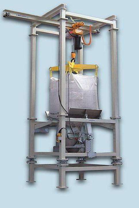拆包機自身配置電動葫蘆將物料吊裝到拆包機的機架上方,然后緩緩下落,物料袋在緩慢下落過程中由人工拆開下料口或者由十字割刀(選配)將物料袋底部劃開,物料靠重力滑落,使噸袋內的粉粒狀物料靠重力落進貯斗中來完成卸料工作。該裝置能有效保護生產(chǎn)環(huán)境,減輕勞動者的工作強度,同時還提gao生產(chǎn)效率,解決了大袋在開袋工作中因吸潮導致結塊、搭橋不易出料的現(xiàn)象。