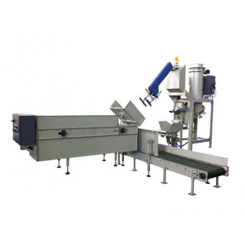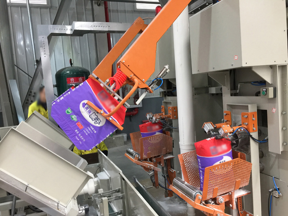 上袋機械手將包裝袋自動拾取、張口、套袋,在上一袋正在包裝時,上袋機械手將下一只包裝袋拾取、張口后等待。